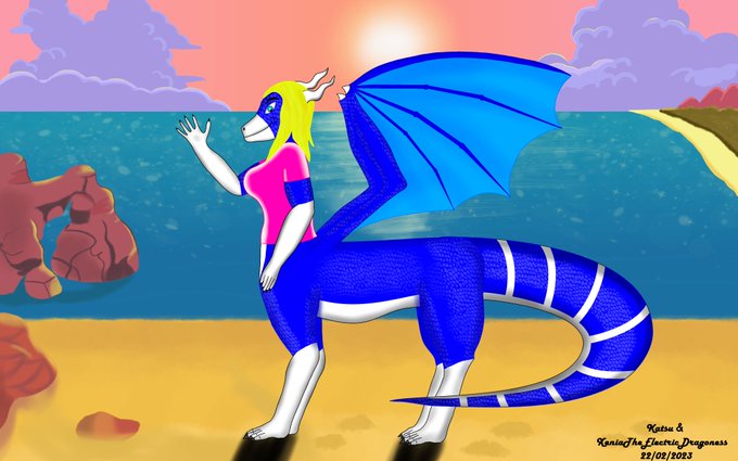 That's an amazing collab between me and my amazing long time friend @KatsuroKurosaki ❤ Katsu did the lovely PMD background, while I've drawn me as a dragontaur ❤ Thanks for the opportunity, dear! #artistsontwitter #digitalart #Collab #pmd #beach #drawing #dragontaur #female