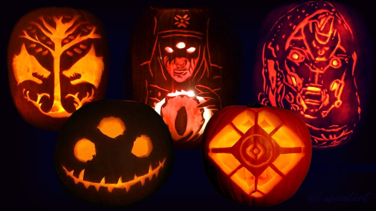 7 years of Destiny pumpkins! 💠🎃 Y1: Jackolyte Y2: Iron Banner Y3: Eris Morn Y4: Cayde-6 Y5: Ghost Y6: Moon Bunny Y7: Eramis It's never too early to plan ahead. Which Destiny 2 themed pumpkin should I carve this year? #tbt #FestivaloftheLost #Destiny2Art