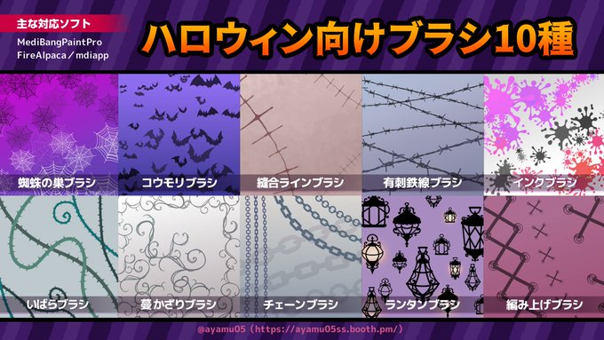 【お知らせ】 BOOTHにハロウィン向け?なダーク・メルヘン系ブラシを10種追加しました!(※無料でDLできます) ◆BOOTH:ayamu05ss.booth.pm #メディバン用ブラシ作ってみた #メディバンペイント #FireAlpaca #MediBang