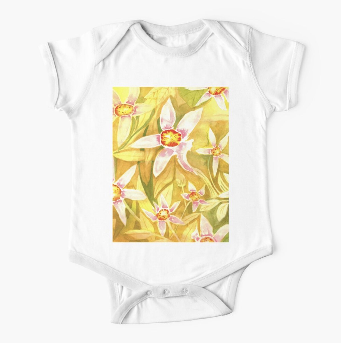 Garden of Eden tinyurl.com/2p84macj on baby clothes in my #Redbubble shop #SmallBusinesses #SupportSmallBusinesses #GiftIdeas #FloralPrint #Flowers #Summer #Nature #Watercolour #Watercolor #Yellow #Babies #BabyClothes #BabyShower #BabyFashion #BabyTees #KidsTees #Children