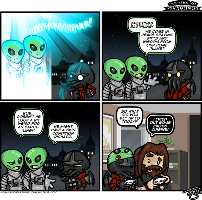 Greetings eartling! We come in peace bearing gifts and wisdom from our home planet 👽 #comic #イラスト #イラスト好きさんと繋がりた #FoodieBeauty #comicstrip #art #Aliens #Food #alien