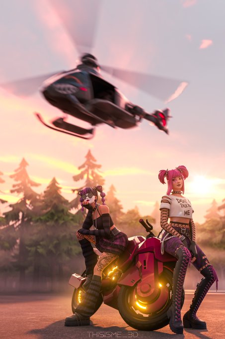 Sunset Vibes with the Girls 🤘 🚁🏍️ Congrats @gigis_lab!! ♥️ #Fortnite #FortniteArt #FortniteRender #Blender3d #FortniteMEGA #FortniteChapter4Season2 #ArtistOnTwitter