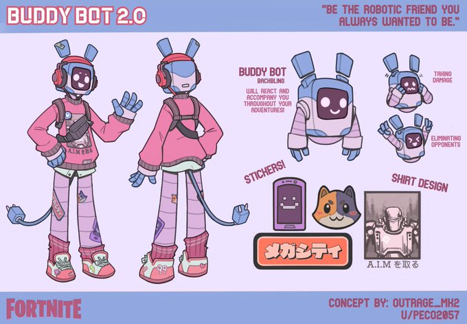 "Let's be best friends forever!" I decided to take the Buddy Bot poster in Mega City and turn it into an outfit concept, complete with a reactive backbling! #FortniteMEGA #FortniteConcept #FortniteFanArt #Fortnite