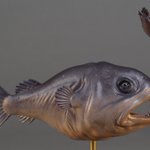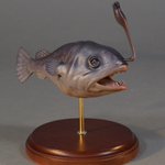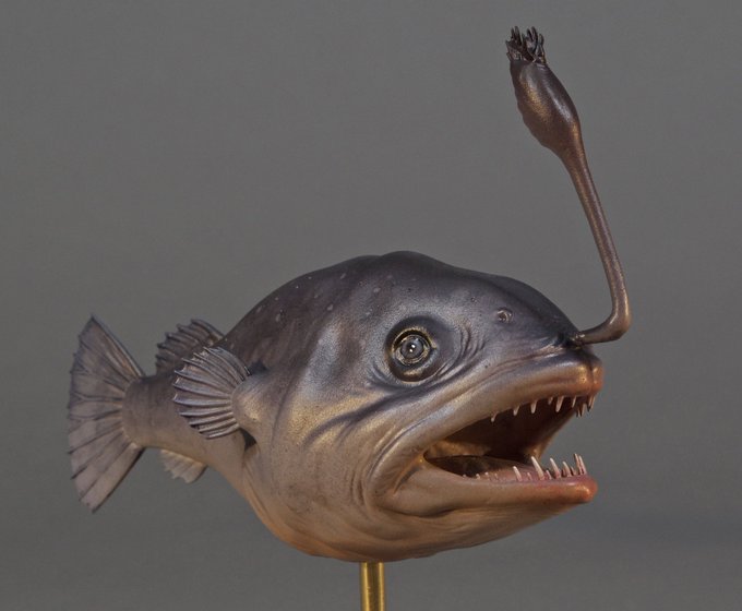 1:1 Chaenophryne melanorhabdus sculpture. Painted in acrylics by airbrush and hand. Happy with some of the subtitles that came out with this paint job. #paleoart #SciArt #SciComm #fossilfish #sculpture #animalart