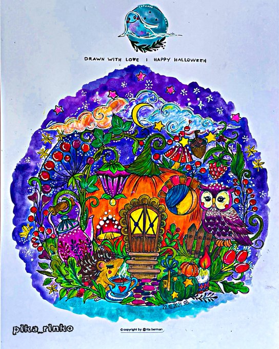 👻Happy Halloween🎃間に合って良かった〜٩꒰ ꇐω ꇐ๑꒱۶ #ritaberman #ritasautumnspecial #ダウンロード塗り絵 #freedownload #大人の塗り絵 #大人のぬりえ #色鉛筆 #透明水彩 #prismacolor #supervision