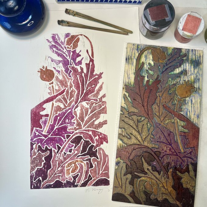 So I thought I’d give this block another go after having to carve out the splintered sections of wood. Really enjoyed doing several color variations (here’s a few). It became very meditative after awhile…😉 #FridayMotivation #artistsontwitter #VivaMagenta2023 #printmaking