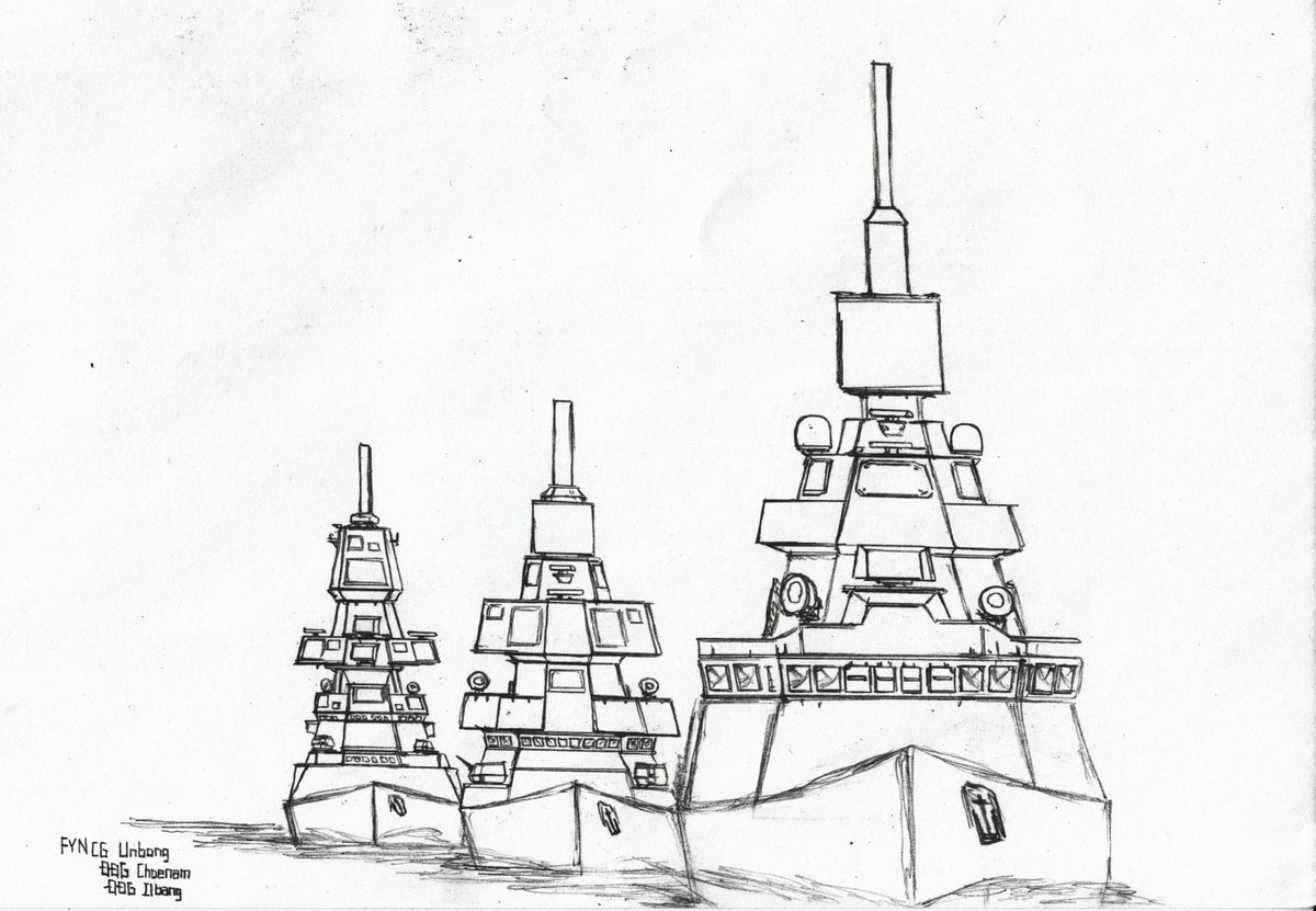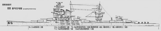#架空艦 #イラスト #Fupusang_Y 名称 수온 장관(Suon Janggwan) 戦艦 主砲 32cm連装砲 2基 副砲 14.4cm連装速射砲 2基 対空 76.2mm単装高角砲 4基 機砲 57mm対舟艇砲(三連装) 1基 副砲 37mm対舟艇砲 2基 →