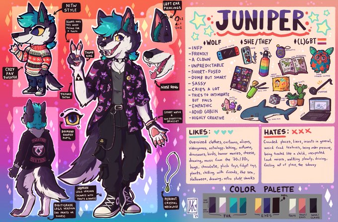 Here's my fursona Juniper's updated ref sheet, I think they look much cooler now! 🌌✨🐺 [#furry #furryart #furryartwork #fursona #furryfandom]