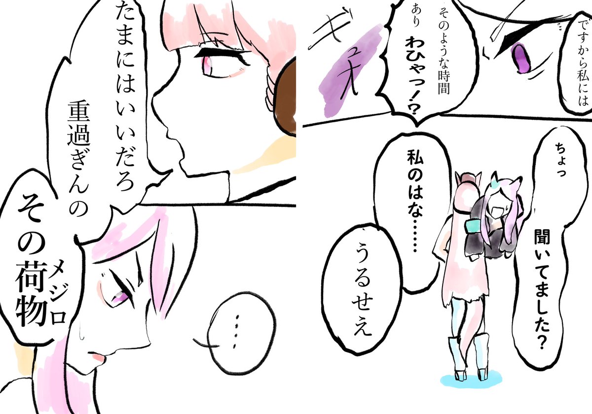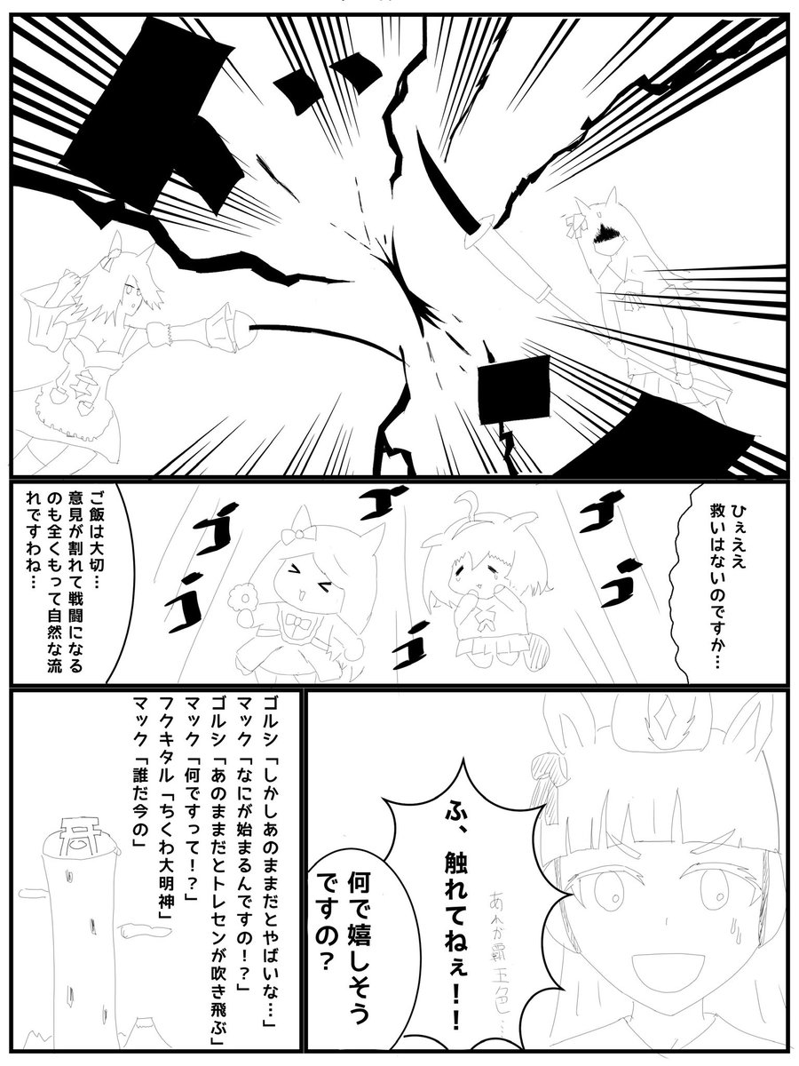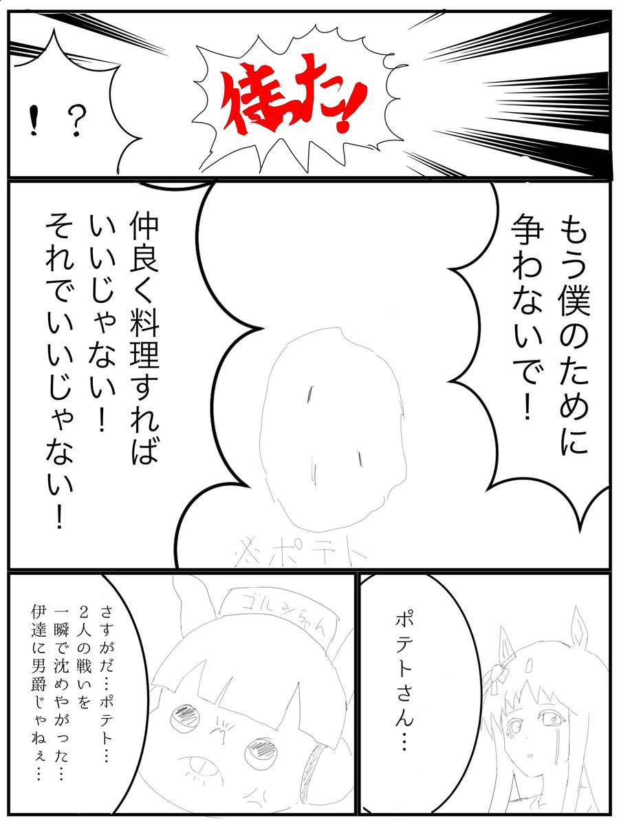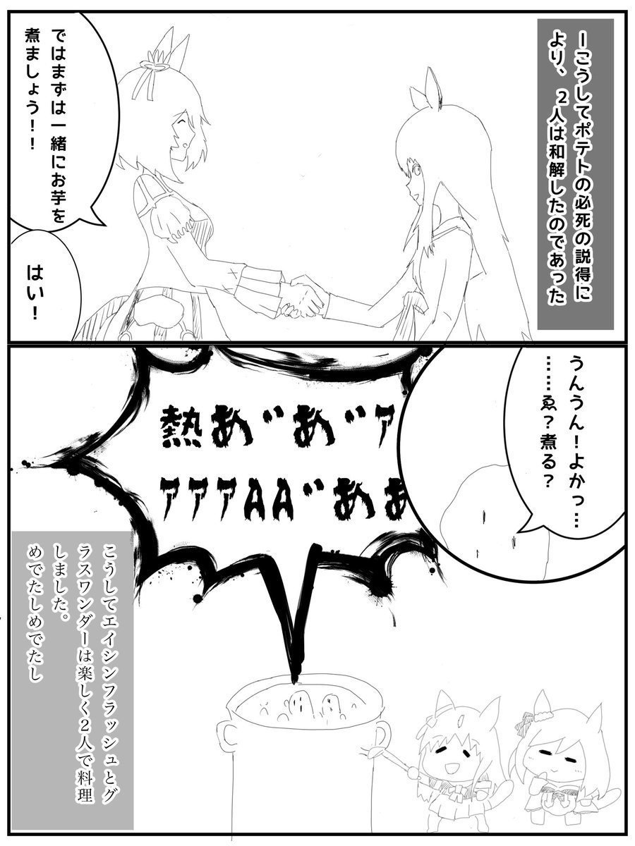 #G2新年ウマ娘イラストリレーステークス2022 4番走者もっさんです! #タイキシャトル と #ライスシャワー は料理…ではなく、どうやらタイキシャトルにやりたいことがあるようで…? 果たしてゴルシが巻き起こした闘い(?)は無事に終わるのか…次回もお楽しみに! #ウマ娘 #ウマ娘プリティーダービー