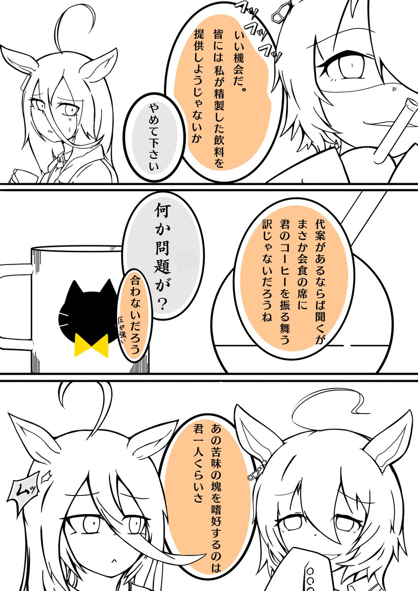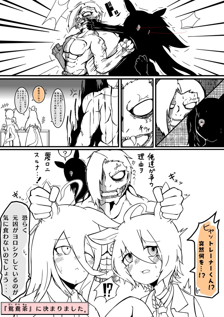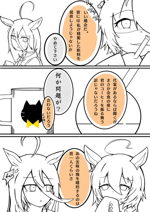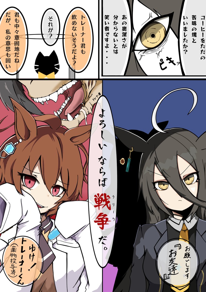 #G2新年ウマ娘イラストリレーステークス2022、 2番走者は兎屋一文字さん【@USAYA_UMA 】! #アグネスタキオン と #マンハッタンカフェ の紅茶党🆚珈琲党争いが勃発! #ウマ娘 モルモットくん大丈夫なの!? 明日も20時に続きが投稿されます! 次は誰だー! twitter.com/CarbonTelomera…
