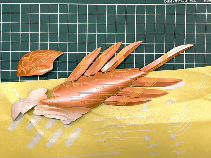 翼が4枚完成しました! 月の女神アルテミスの翼 太陽の女神アマテラスの翼 天空の女神ニケの翼 大地の女神ガイアの翼 4女神の名を冠した翼を背負った最強のメガミ、というマイ設定😆 #メガミ・エアリアル #水星の魔女 #GBWC11th