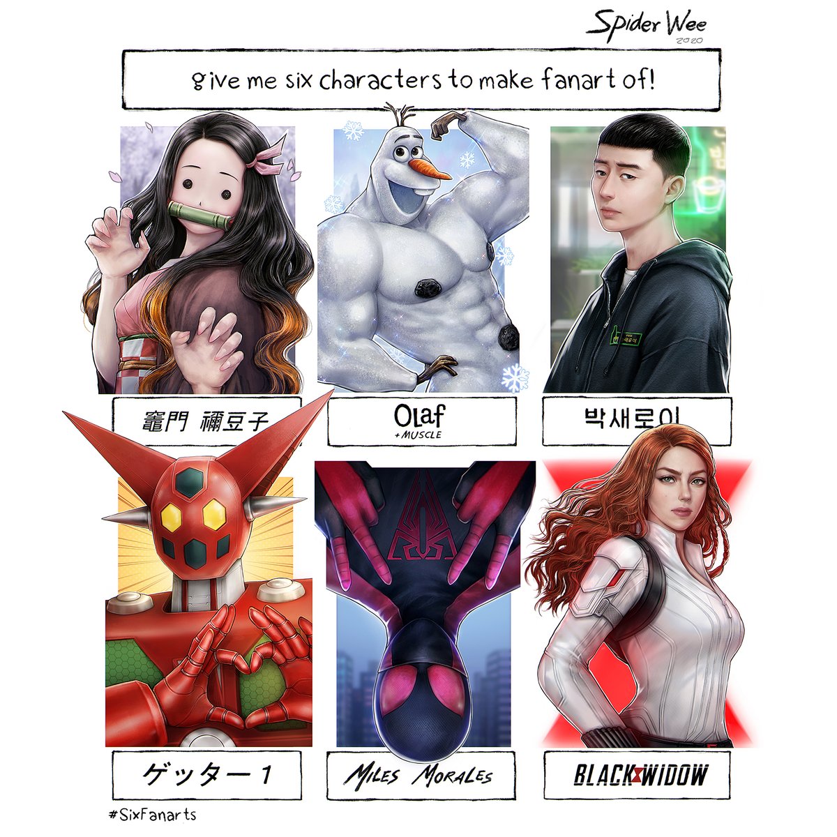 Six Fanarts Art Challenge ของปีที่แล้วครับ เพิ่งจะได้ทำให้เสร็จ 55+ This is Six Fanarts Art Challenge from my facebook fanpage at last year. I just finished. #SixFanarts #nezuko #olaf #parksaeroyi #getter1 #milesmorales #blackwidow #spiderwee