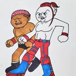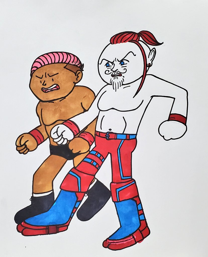 リンダマン選手とゼイン選手。 ちょっとだけ手塚治虫先生風に描いてみました。 塗りムラがあるのはアナログなので、そこはご愛敬で😁。 またこの二人のタッグが観られますように✨️。 #ElLindaman #エル・リンダマン #AlexZayne #GLEAT #njpw #njSJTL #njpwfanart