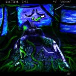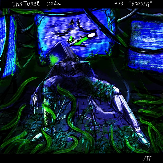 Here is the drawing from yesterday, #23 "Booger". Decided to go robot with this one. #inktober2022day23 #inktober #booger #color #robot #digital #tentacles #horror #glitch #vines #clipstudiopaint