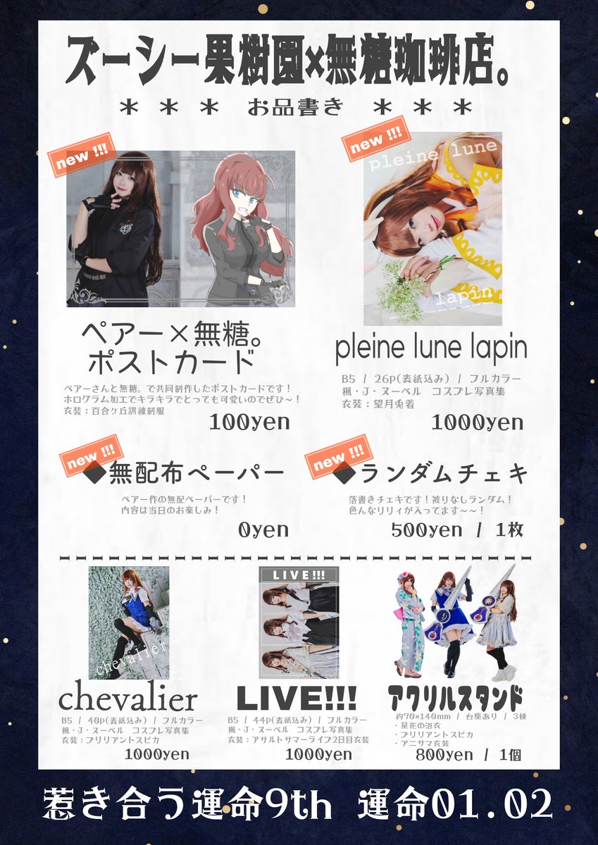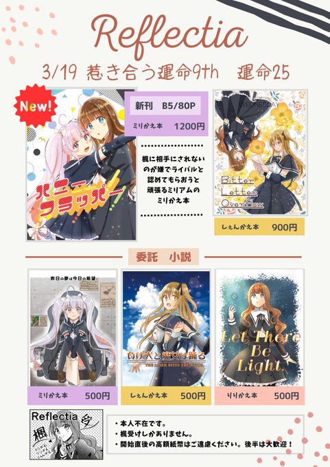 明日の惹き合う運命9thのお品書きです!スペースは運命25【Reflectia】にて頒布予定です。楓・J・ヌーベル受けの本しかありません!!よろしくお願いします!! #GLFes #惹き合う運命9th