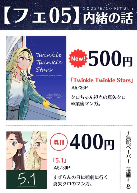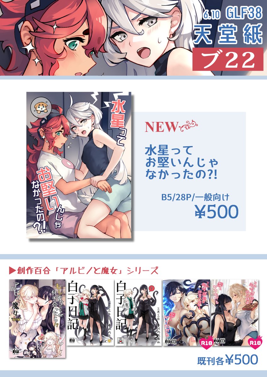 6/10(土) #GLFes38「天堂紙」のお品書きです 【ブ22】にてお待ちしております! 水星の魔女新刊と創作百合既刊持っていきます どうぞよろしくお願いします! #GLFes ▼スレミオ本サンプル▼ twitter.com/itsuki20140102…