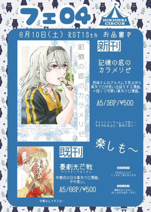 明日開催されるRST12thのお品書きです。未定部分は今絶賛頑張り中。新刊サンプルはリンクのツイートからどうぞ。舞台20で待ってる! twitter.com/konnithiha/sta… #RST12th #GLfes