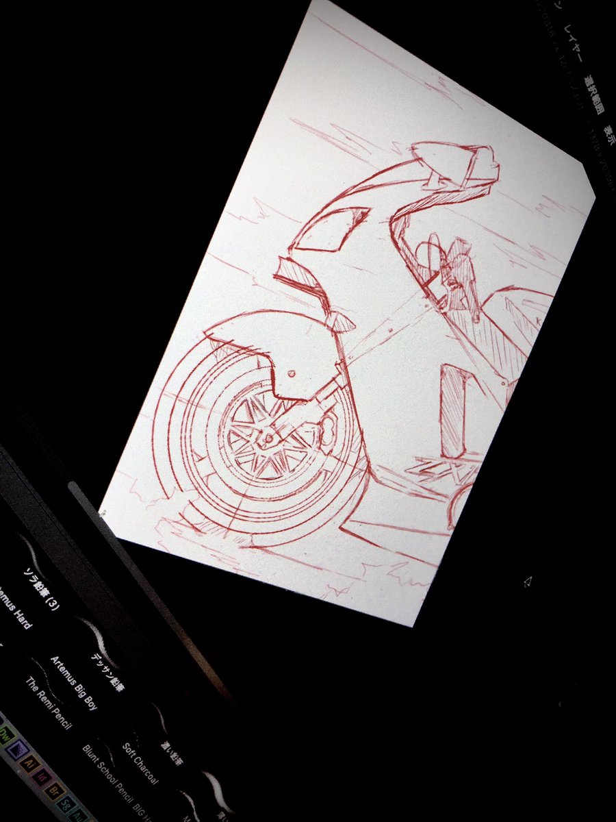 続・GSX-R750('85)進捗。フロントタイヤのトレッド幅は、このほんのり太い感じで行く事にしました。油冷GSX-Rには迫力が欲しい。5割を超えた辺りまで、絵を持ってきたでしょうか……(多分) #イラスト #RIP #バイク #Illustration #motorbike #GSX #SUZUKI