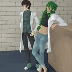 Annnnnd finally!!! #BaizhuWeek day 7!! Free day! A lil modern universe Baizhu and Gui 😌 I forgot to add Changsheng around Baizhu's shoulders and I am devastated. #baizhu #gui #herbalistgui #GenshinImpact #genshinimpactfanart