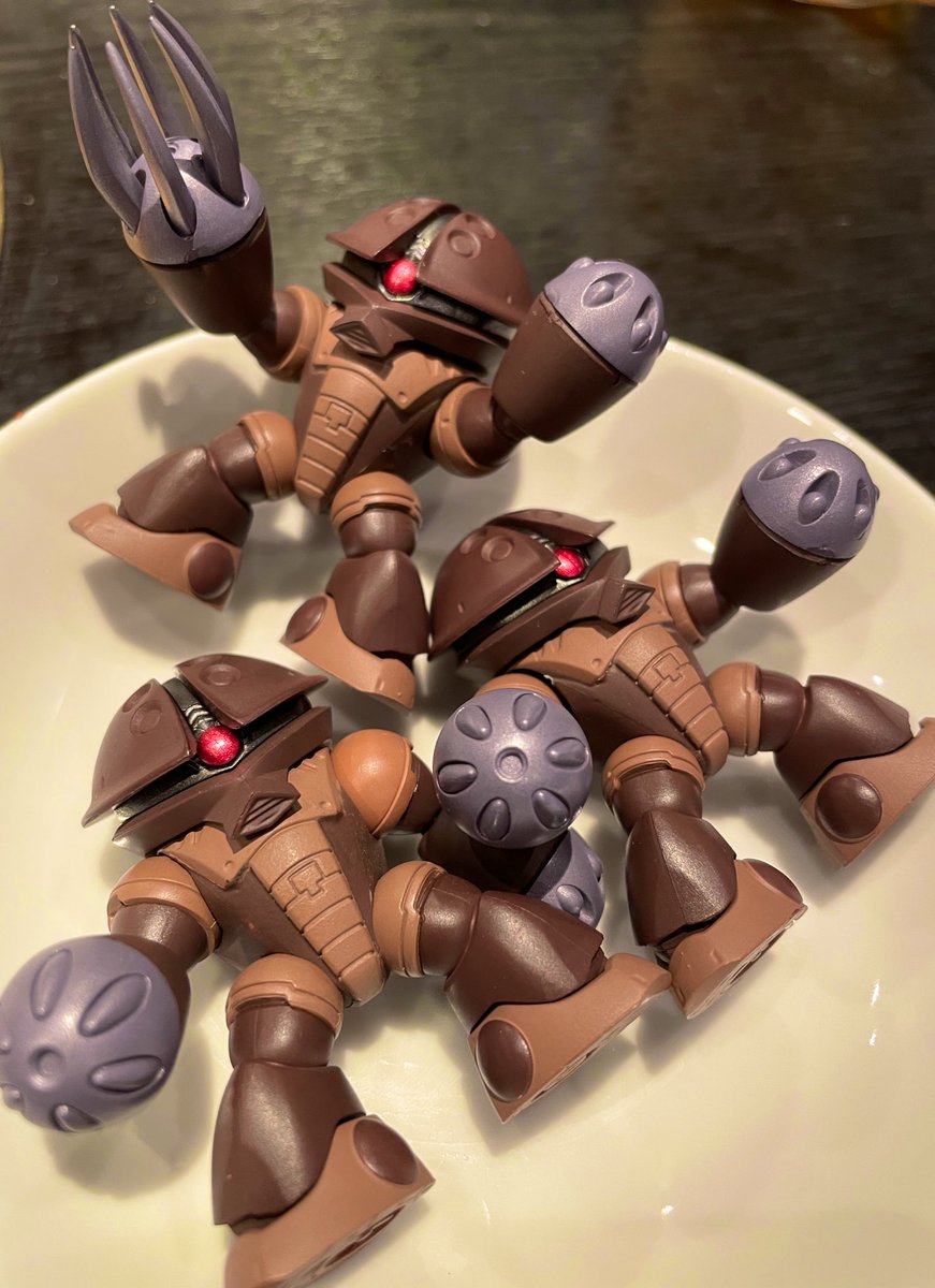 #gundam #ガンダム #ガンプラ #ガンプラ好きと繋がりたい #ガンプラ再販 #アッガイ #コンバージ #gundamconverge 10周年記念再販アッガイ 色々回って4機GET💕💕 沢山欲しい〜可愛い〜🥰! チョコみたいやからお皿に置いてみたw