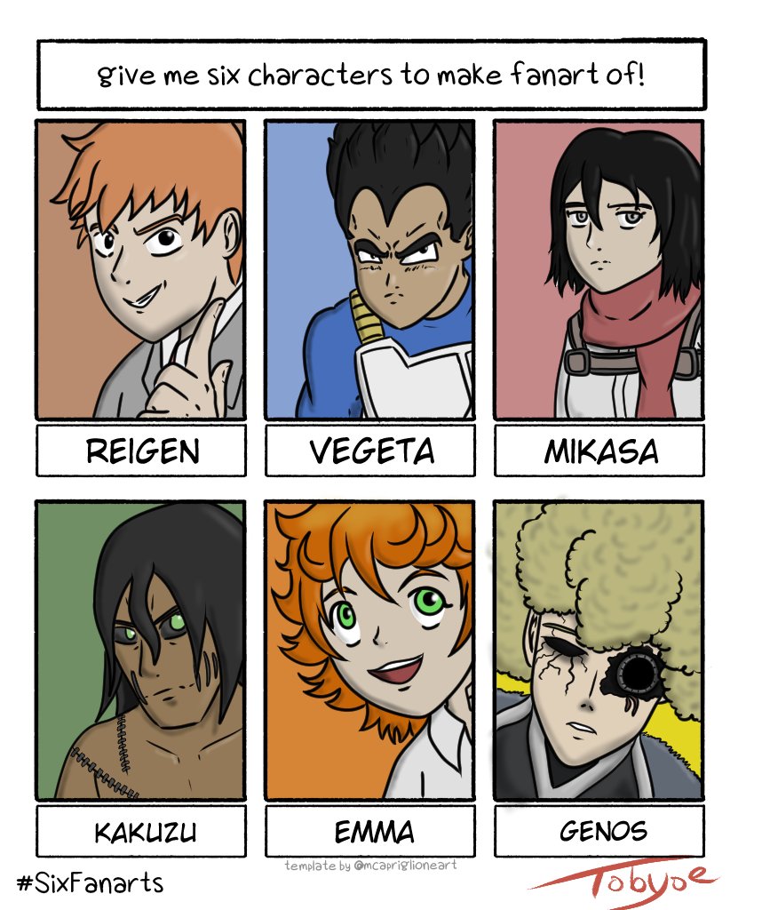 Sorry I haven't updated my webcomics lately. Got busy then got glum. Did this thing for funsies to get me back into the groove. #sixfanarts #fanart #art #mobpsycho100 #reigenarataka #dragonball #vegeta #attackontitan #MikasaAckerman #naruto #kakuzu #onepunchman #genos