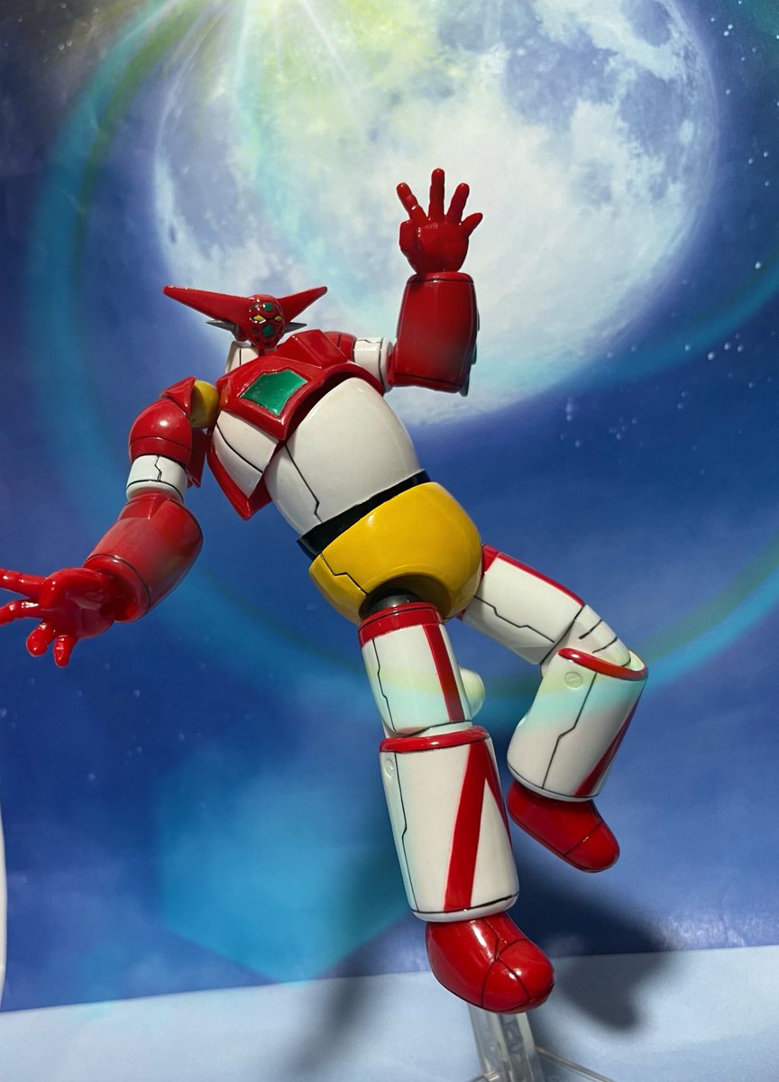 #夜のフィギュア撮影会 お題「この写真のここがこだわり!」 ノーギミックでもカッコいい🤩!…というスポロボ合金玩具の特性を活かし、あえて台座乗せで勝負した1枚🙂 #GetterPhotoMuseum #GuernicaCollection Soul of Chogokin GX-06M📸
