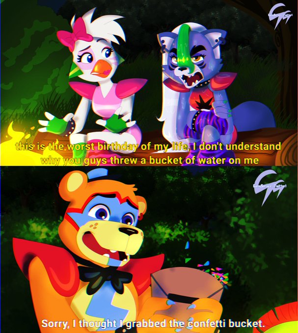 contexto rápido: Llegaron a Roxanne al bosque de cumpleaños para pasar una hoguera, pero Freddy, en vez de arrojar cómo sopresa una cubeta con confeti, arrojó una con agua ª #fnaf #fnafsb #fnafsecuritybreach #glamrockfreddy #glamrockchica #roxannewolf #montgomerygator #fnaffanart