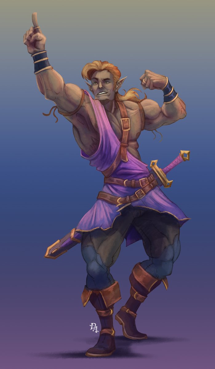Vainglorious Legstrong! Please, hold your applause! - Elf Bard Gladiator #dnd #dndart #dndcommission #dungeonsanddragons #bard #gladiator #entertainer #muscles #gym #gymbro #gold #blonde #commission #commissionsopen #commissionart #elf #elven