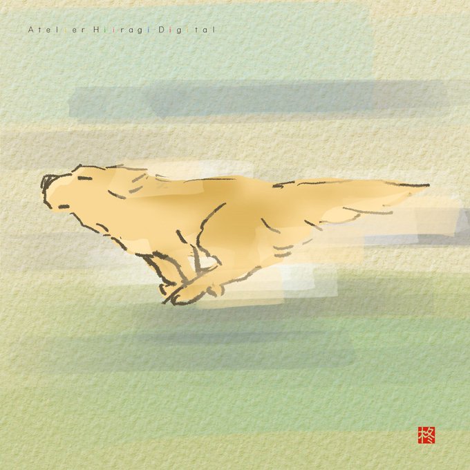 GALLOP 自慢話を聞いてください。ウチの子は半年間,代々木公園のドッグランで韋駄天王でした。快足自慢のボーダー・コリーもハウンド犬もタローが3才の頃のスピードにはかなわなかったのです。 #procreate #illustration #tabletpainting #イラスト #goldenretriever #虹の橋