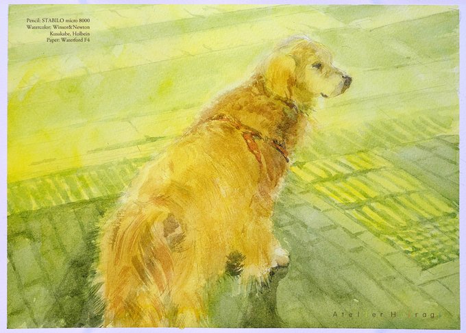 横断歩道で振り返る A4(297*210mm) For Sale↓ shirabe.sunnyday.jp/shucream/top/a… 詳細はDMでお問い合わせください。 #watercolor #art #水彩 #goldenretriever #虹の橋
