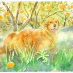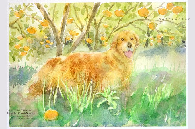 ミカン狩り Orange Picking 小田原にて in Odawara #watercolor #art #水彩 #goldenretriever #虹の橋 For sale↓ shirabe.sunnyday.jp/shucream/top/a…