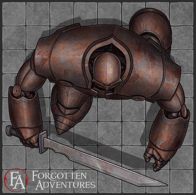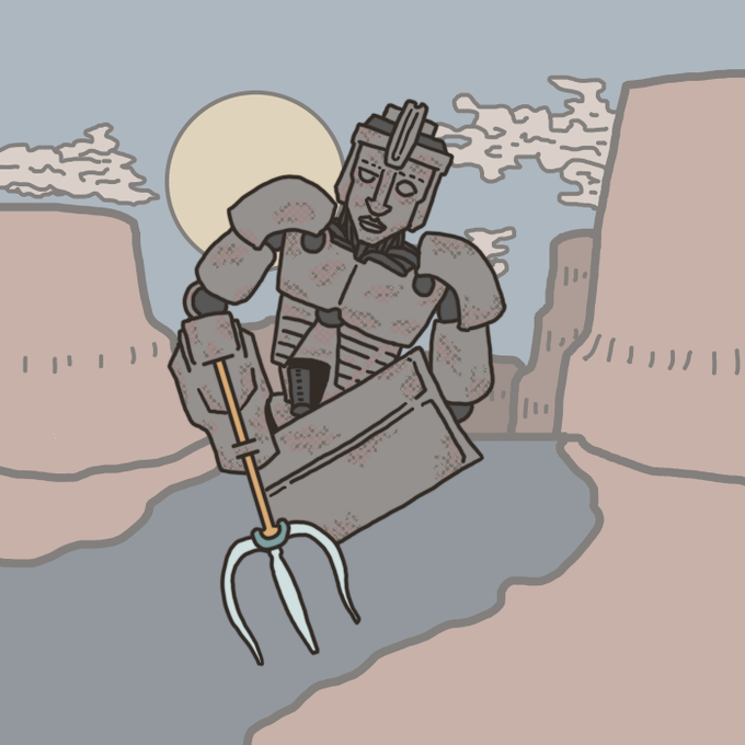 #inktober2022 Day 27 Voc the Shield Guardian; Likes: Orders Dislikes: Water, but they like order more. Has a Trident of fish command mounted on one arm. #ttrpg #robot #golem #dungeonsanddragons #digitalart They're a bit rusty but still good to set a croc on the party.