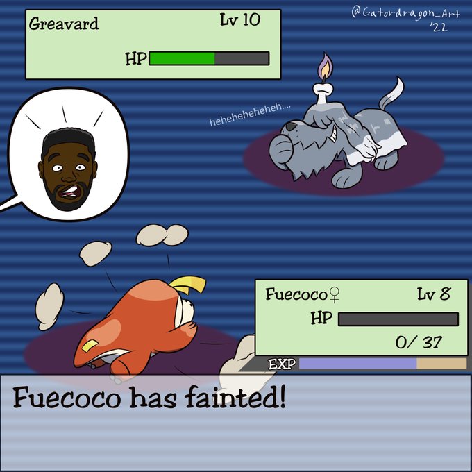 Lucky shot, Greavard! You win this time. And stop that wheezy laughing! - #art #digitalart #BlackArtist #artist #ArtistOnTwitter #Pokemon #PokemonScarletViolet #Greavard #fuecoco #fanart