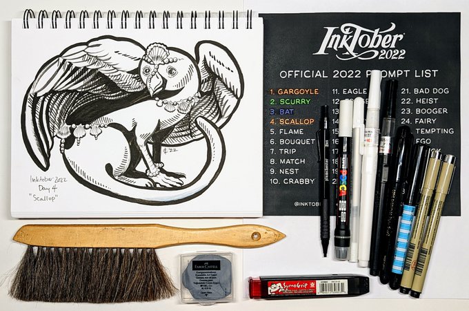 #Inktober day 4: Scallop 🦪 Tried a new technique to make my drawings more dynamic! Watch the video replay here: twitch.com/studiomikarts #Illustration #Drawing #Ink #Fantasy #Gryphons #Twitch #Inktober2022 #Kuretake_Inktober #Kuretake_Inktober2022 #MoleskineInktober