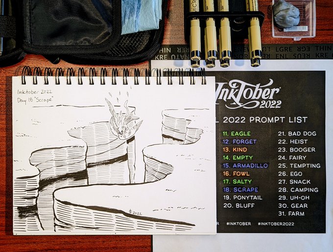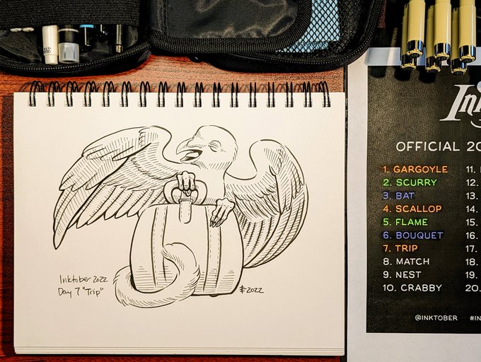 #Inktober day 7: Trip 🧳 Two of six prompts for today complete! #focusretreatcenter #Illustration #Drawing #Ink #Fantasy #Gryphons #Twitch #Inktober2022 #Kuretake_Inktober #Kuretake_Inktober2022 #MoleskineInktober