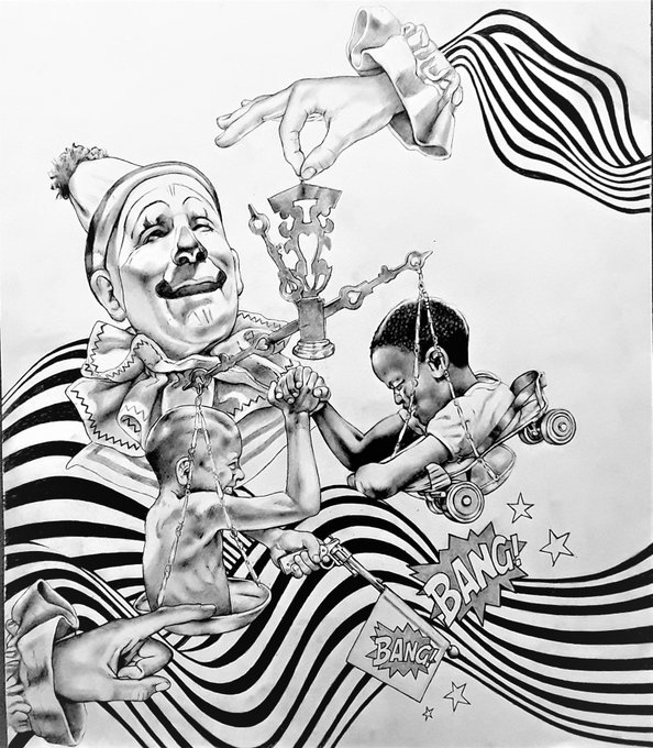 " Chitty Chitty Bang Bang, Kenosha Clown Show," 18" x 24" graphite on paper, by Ray Castro #artvsartist2021 #artwork #ArtistOnTwitter #artist #ArtAdventCalendar #GunViolence