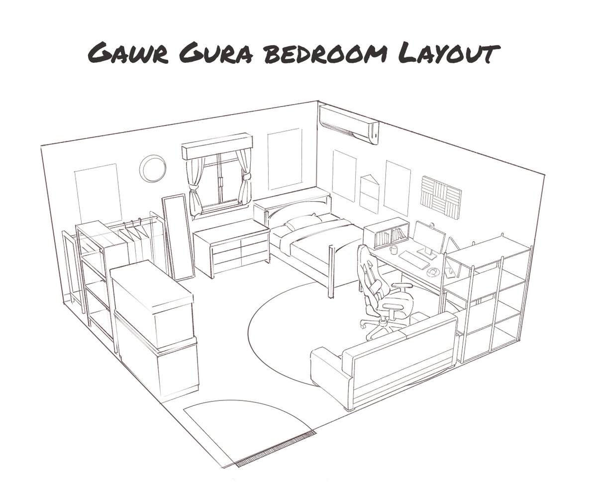 Some people asked for it so here's Gura's bedroom layout for art reference 🛋️ Layout: @calvinzhong_ Color: @GreenBlueClouds #gawrt #Gura3DLive #HololiveEN #hololive