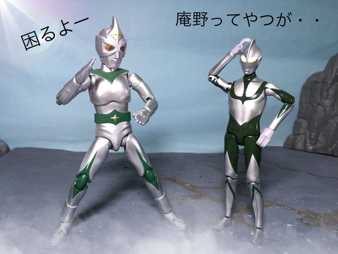 ミラーマン先輩に厳重注意を受けるリピア消耗時Ver.!? ← 色被りと、緑=弱いという悪いイメージがつくことに抗議してるらしい😆 #ミラーマン #シン・ウルトラマン #シンウルトラマン #ウルトラアクションフィギュア #HAF #エヴォリューショントイ #ウルトラマン #オモ写