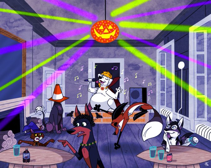 A 101DS-related Halloween commission for @BabArt101Dal featuring several OCs (and a foxy familiar face) at a spooktacular party 🎃🏚🎉😉 #Spooktober2022 #101DalmatianStreet #Fergus #halloweenparty #fanart #furryart #ocart #commissionart #halloweencommission #Halloween2022