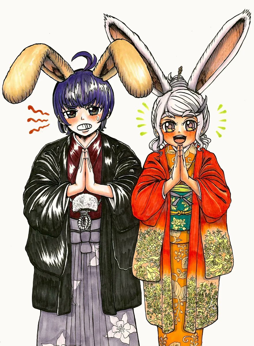 「卯年ハヤト&フタバ」 instagram↓ buff.ly/3OkzAZF pixiv↓ buff.ly/3GeKFG8 #2023年 #ハッピーニューイヤー2023 #HappyNewYear2023 #卯年 #オリジナル #オリキャラ #年賀状 #イラスト #かわいい #少年 #少女 #うさぎ #ウサ耳 #着物好きさんと繋がりたい #イラスト #アナログ