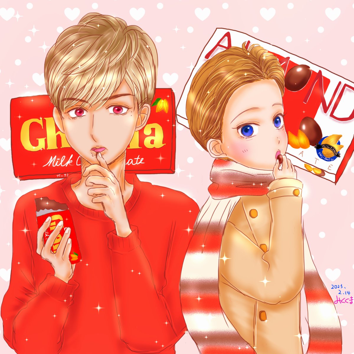 今年のバレンタインはファンアート2枚でしたが、オリキャラだと4年前(左)と昨年(右)のとで2枚あります🍫 個人的には4年前のがお気に入りです #HappyValentine #創作 #イラスト