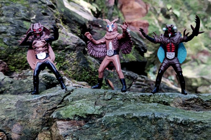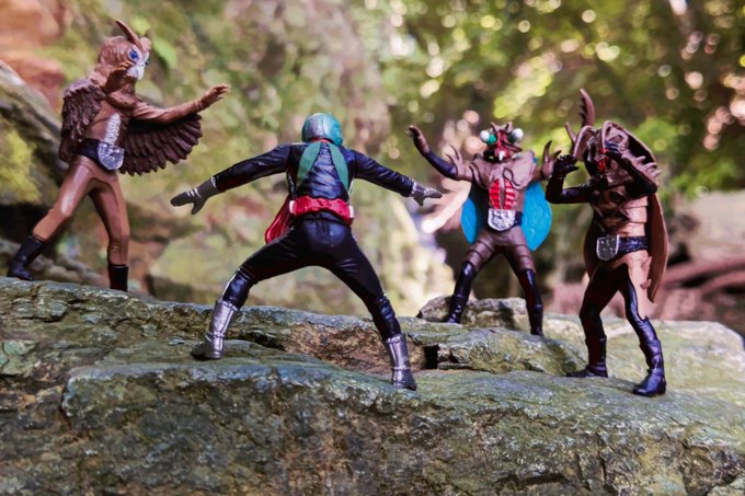 【吸血モスキラス対 二人ライダー】 今日はHGシリーズ日和ですね( ´∀`) #仮面ライダー #仮面ライダー新1号 #仮面ライダー新2号 #モスキュラス #オモ写 #特撮 #ガシャポンHG #HGクラシック2