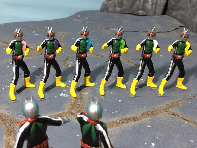 #夜のフィギュア撮影会 お題『必要』過去作 ショッカーライダーに囲まれたダブルライダー!←天高く飛び上がって放つ新必殺!ライダー車輪! #仮面ライダー #ショッカーライダー #HG仮面ライダー #仮面ライダー1号 #仮面ライダー2号 #オモ写