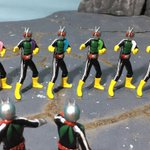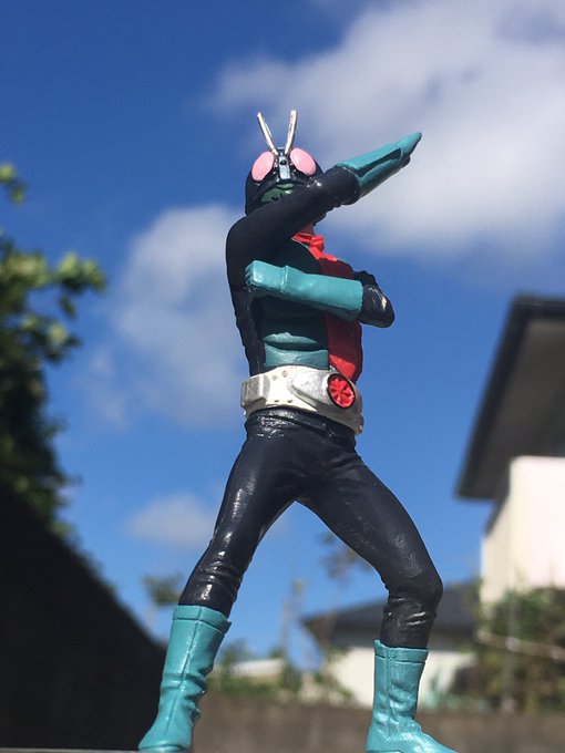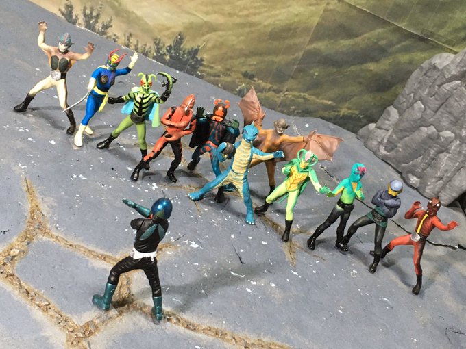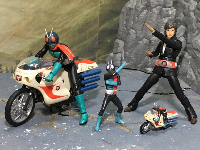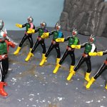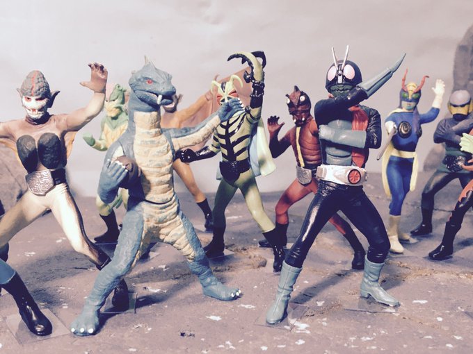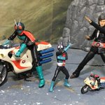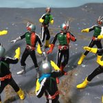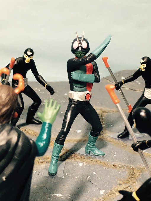 #夜のフィギュア撮影会 お題『天』 ショッカーライダー VS ダブルライダー!←天高く飛び上がったと思ったら・・全員がぶつかり合って絶命!?見たか!必殺ライダー車輪! #仮面ライダー #ショッカーライダー #HG仮面ライダー #仮面ライダー1号 #仮面ライダー2号 #オモ写