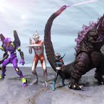 #おもちゃ撮影会 テーマ『クロスオーバー』 シン・ジャパン・ヒーローズ・ユニバース! #ゴジラ #シン・ゴジラ #仮面ライダー #シン・仮面ライダー #ウルトラマン #シン・ウルトラマン #エヴァンゲリオン #モンスターアーツ #ムービーモンスターシリーズ #ソフビ #リボルテック #HG仮面ライダー