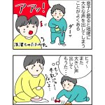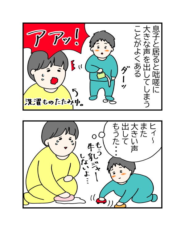 #気にしすぎるアラサー絵日記 「大声」 教育上よくないとか言われるけど咄嗟に出ちまうんだよ・・・ #HSPあるある #繊細さん #コミックエッセイ #漫画が読めるハッシュタグ #みんなで楽しむTwitter展覧会 #絵描きの輪 #アトリエの系譜 #4コマR #育児絵日記
