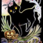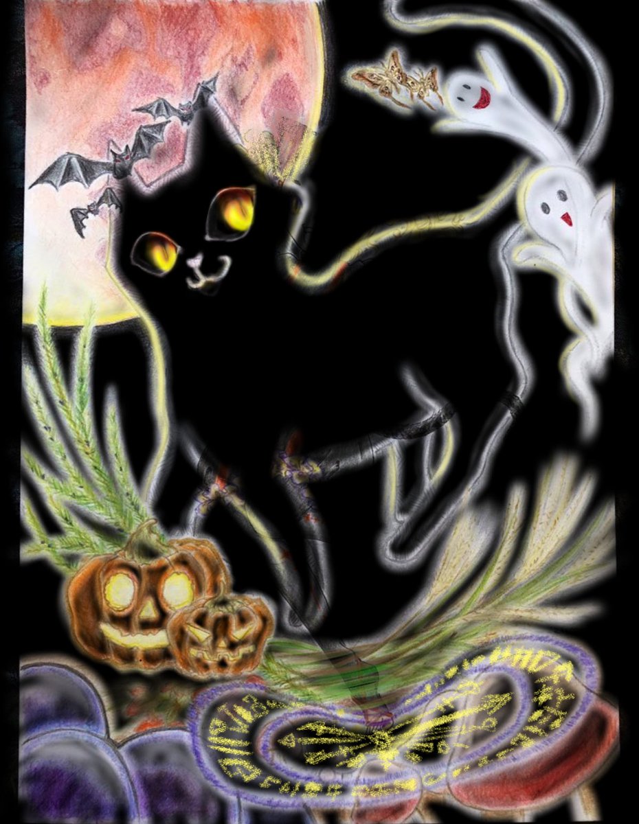アナログのハロウィン絵(去年描いた今思えば要素盛り込み過ぎのやつ😂)を流用して、デジタル取り込み&スクラッチしてみました🐈⬛#ハロウィンイラスト #Halloweenillustration #創作イラスト #ハロウィンイラスト2022