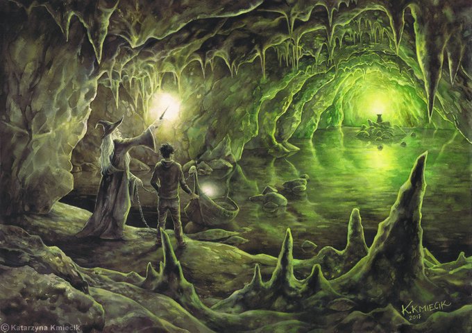 Dumbledore and Harry in the Horcrux Cave. My watercolor #illustration inspired by the "#HarryPotter and the HBP" by J. K. Rowling. Tell me which book scene you'd like me to illustrate next! Prints + original artwork: bit.ly/horcrux-cave-p… bit.ly/original-horcr…