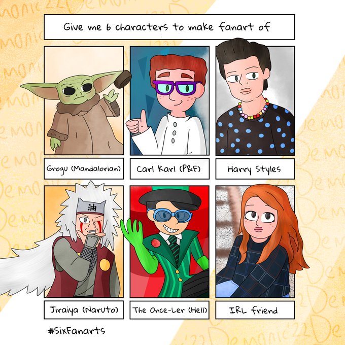 #SixFanarts finished! I did not expect the suggestions to be so... unique #TheMandalorian #PhineasAndFerb #HarryStyles #NARUTO #illumination #fanart #FanArtFriday