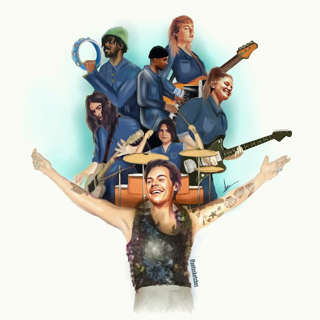 I never drew so many instruments in one sitting 🤭🎨 but I had to illustrate this dream team 🌟 I hope you guys like it! 🤍 @Harry_Styles @HSHQ #HarryStyles #LoveOnTour #digitalart #painting #fanart #art #illustration #drawing